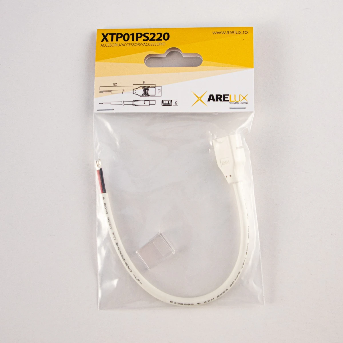 Element de alimentare etanș Arelux Xtap XTP01PS220 pentru benzi LED de 10 mm, IP65, cu cablu de 182 mm, ideal pentru conexiuni sigure și eficiente la 220V AC.