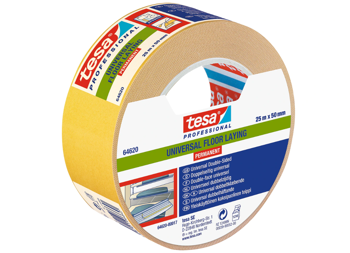Bandă dublu adezivă Tesa 64620 este ideală pentru fixarea permanentă a pardoselilor cu greutăți mici și medii, precum și pentru utilizări generale de montaj. Compozită dintr-un suport din polipropilenă albă și un adeziv din cauciuc sintetic, această bandă oferă o aderență ridicată și nu conține solvenți. Este protejată de o căptușeală din hârtie siliconată, asigurând o aplicare ușoară și sigură.