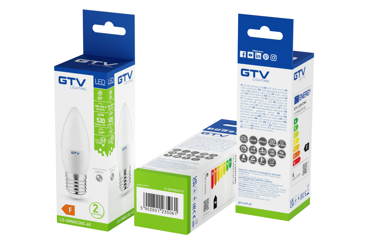 Bec LED lumânare GTV E27 6W, 470lm, 160°, lumină neutră 4000K, eficient energetic și durabil.