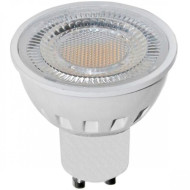 Bec LED SMD GU10 10W lumină caldă, unghi 105°, durată de viață 25.000 ore.