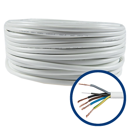 Cablu electric MYYM 5x2.5 mm² din cupru multifilar, izolat și mantat cu PVC gri. Potrivit pentru instalații electrice interioare, circuite de comandă și alimentare trifazată.