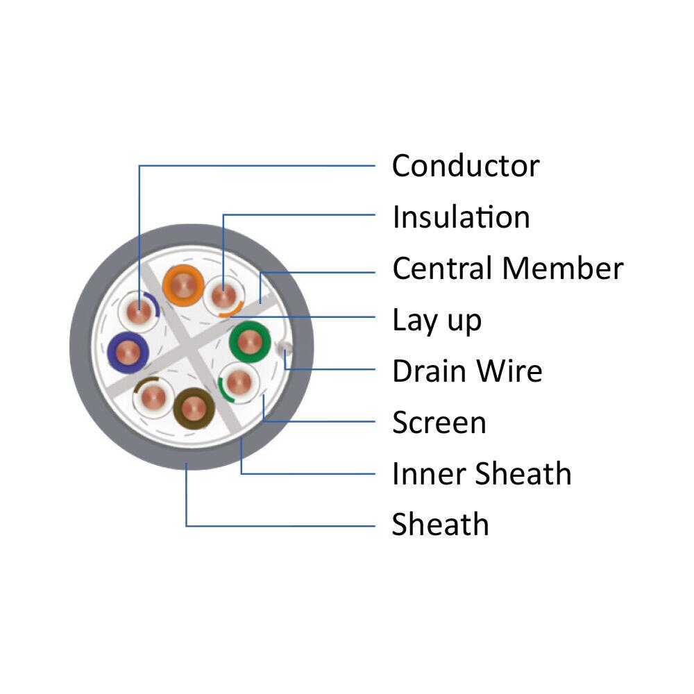 Cablu FTP Cat6 de înaltă calitate, cu conductori din cupru solid, ideal pentru rețele de date de mare viteză. Ecranat cu folie de aluminiu pentru protecție împotriva interferențelor electromagnetice. Potrivit pentru utilizare în interior, cu o lungime de 305 metri și o manta exterioară de culoare gri.