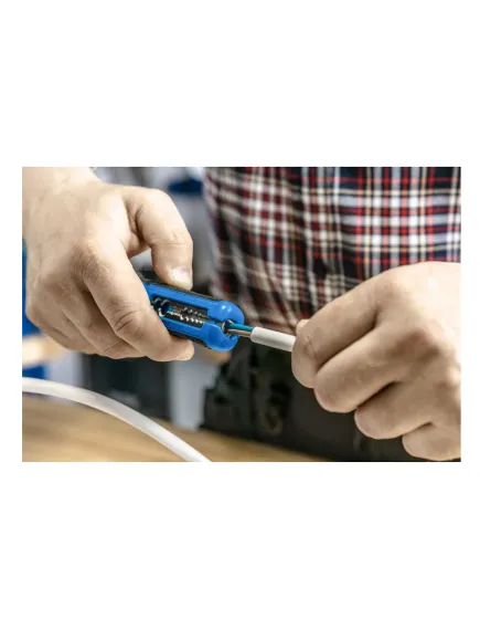 Cleștele dezizolator Hoegert HT1P102 este un instrument esențial pentru electricieni și tehnicieni, conceput pentru a îndepărta izolația cablurilor cu secțiuni cuprinse între 0,5 și 6 mm². Fabricat din metal de înaltă calitate, acest clește asigură durabilitate și precizie în utilizare. Mânerul ergonomic din plastic oferă confort sporit și o prindere sigură în timpul lucrului. Cu o lungime de 122 mm, este compact și ușor de manevrat, fiind ideal pentru lucrări în spații restrânse. Acest clește este compatibil cu cabluri de tip RG6 și RG59, fiind potrivit pentru diverse aplicații în domeniul electric.