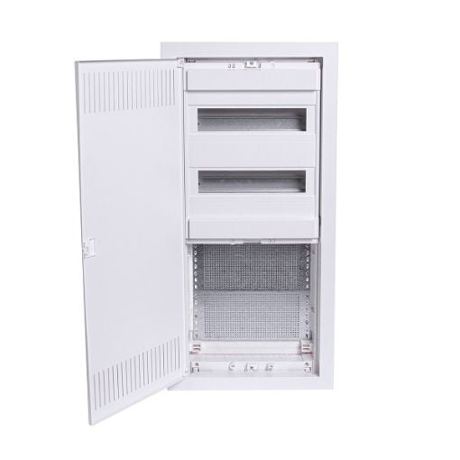 Fabricat din plastic de înaltă calitate, tabloul are o adâncime de 87 mm, fiind ușor de montat în pereți sau pe suporturi. Distanța între echipamentele modulare de 12+2 mm asigură o bună ventilare și accesibilitate, iar capacul închis protejează componentele de praf și umiditate, având un grad de protecție IP30.