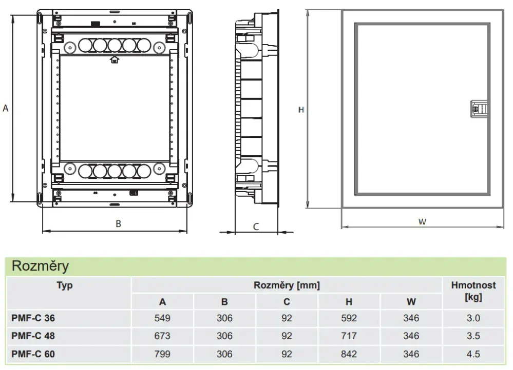 Cofretele PMF-C sunt destinate în principal aplicațiilor rezidențiale. Acestea combină dispozitivele energetice și cele de IT, oferind posibilitatea de a fi plasate într-un singur cofret. Această soluție economisește spațiu și contribuie la un confort sporit pentru utilizator. Designul este potrivit pentru montarea încastrată, având un sistem dublu de fixare pentru pereții cu imperfecțiuni. Cofretul a fost testat cu fir încins la 850°C, iar ajustarea pe înălțime a cadrului metalic permite compensarea imperfecțiunilor peretelui. Cofretele sunt disponibile în versiuni de la 1 până la 4 plăci de montaj și până la 3 șine DIN. Gradul de protecție este IP30, iar gradul de protecție mecanică IK06. În livrarea standard sunt incluse: carcasă, ușă metalică perforată, plăci de montaj, șine DIN, partiție fără priză, materiale și instrucțiuni de montare.