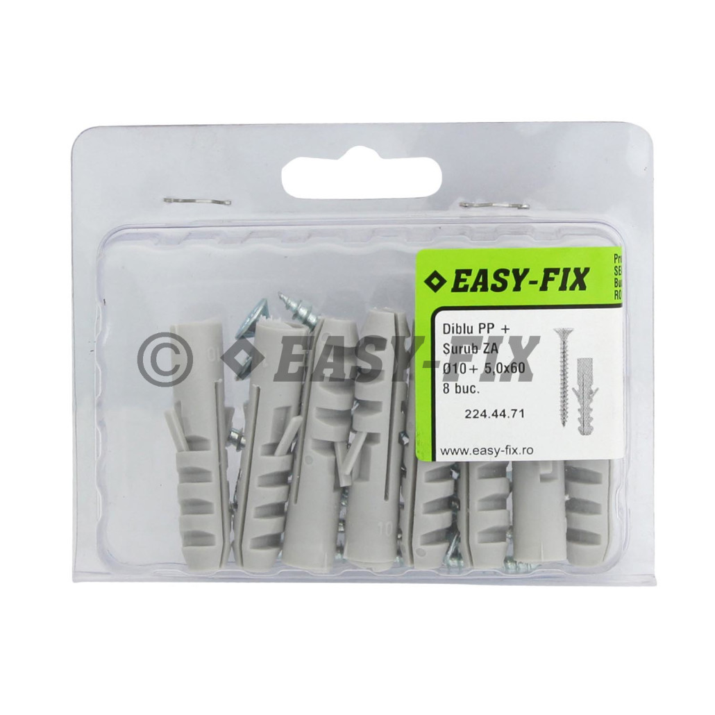 Diblu tridirecțional cu șurub cap înecat, fabricat din polipropilenă și oțel zincat, potrivit pentru fixarea în beton, cărămidă plină sau BCA.