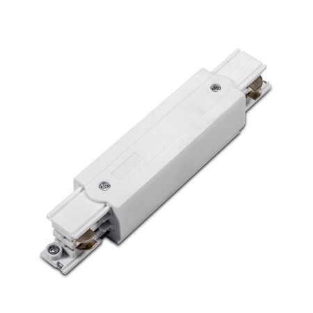 Conector Tip I alb pentru șină cu 2 linii, 230V, fabricat din aluminiu, ideal pentru extinderea sistemelor de iluminat pe șină.