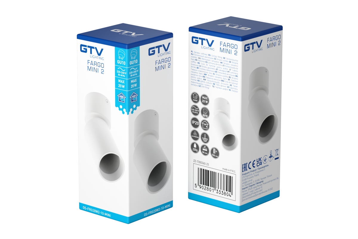 Spotul de tavan FARGO MINI2 de la GTV este un corp de iluminat modern, realizat din aluminiu de înaltă calitate, cu un design cilindric și finisaj alb. Acesta este echipat cu un soclu GU10 integrat și suportă o putere maximă de 20W.
