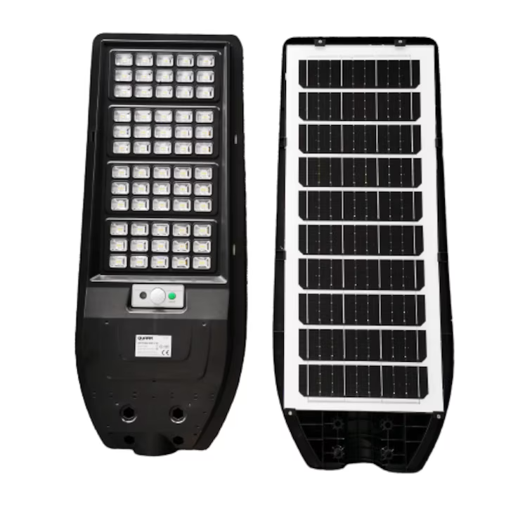Corp stradal LED 150W cu panou solar integrat, 1800 lumeni, senzor de mișcare și telecomandă, marca Quark. Acest corp de iluminat stradal este ideal pentru iluminarea eficientă și ecologică a drumurilor, parcărilor și altor zone exterioare.