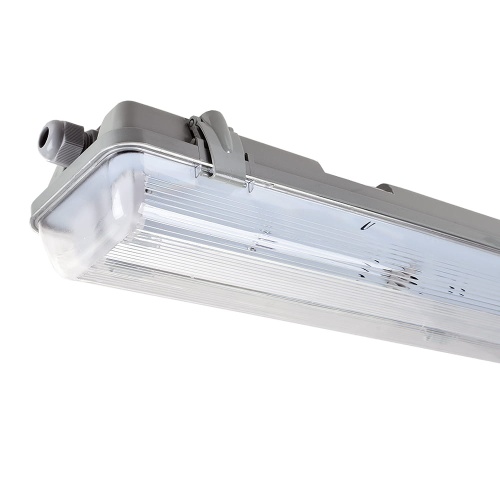 Corp de iluminat tip FIPAD, proiectat pentru utilizarea cu două tuburi LED T8 de 60 cm, ideal pentru spații cu umiditate ridicată și praf, precum hale industriale, spații comerciale, depozite și ateliere. Carcasa și difuzorul sunt fabricate din policarbonat, asigurând o etanșeitate ridicată și o protecție IP65 împotriva prafului și apei. Corpul este prevăzut cu o presetupă pentru alimentare și este conceput pentru montaj aparent pe tavan.