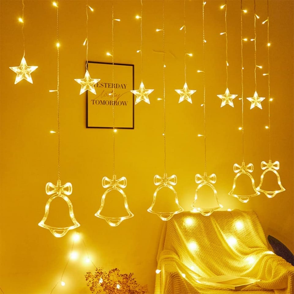 Perdea luminoasă de Crăciun cu 138 de LED-uri, 6 stele mari și 6 mici, 8 moduri de iluminare, pentru interior.