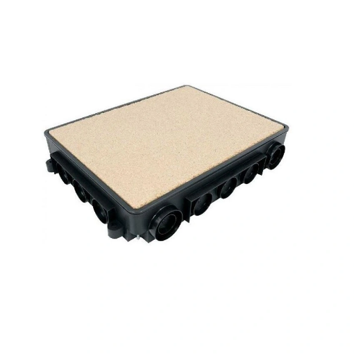 Doza universală de pardoseală KUP 57_FB pentru instalare în podele din beton, fabricată din poliamidă rezistentă la foc, cu dimensiuni de 332x250x57 mm.