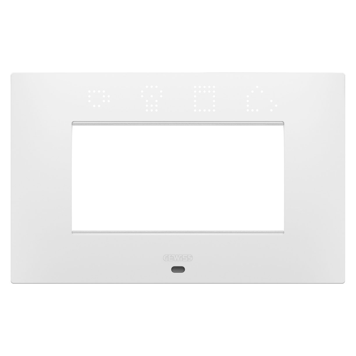 Placa EGO SMART de la Gewiss, cu 4 module, culoare alb satinat, este realizată din tehnopolimer vopsit și are un finisaj mat. Aceasta dispune de un display grafic cu matrice de puncte și benzi LED RGB, oferind o interacțiune avansată cu utilizatorul și alte dispozitive conectate din sistemul ChoruSmart. Placa comunică stările de funcționare și alarmele detectate de alte funcții smart care controlează locuința. Compatibilă cu suportul GW16804N.