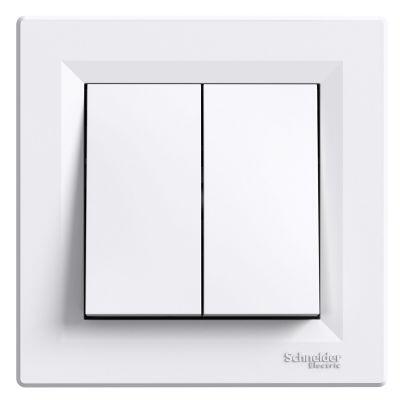 Intrerupator dublu Asfora alb, montaj încastrat, curent nominal 10A, finisaj lucios, livrat cu ramă inclusă.