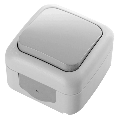 Întrerupător simplu VIKO Antigron, montaj aplicat, IP54, 10A, 250V, gri, ideal pentru utilizare în interior și exterior.