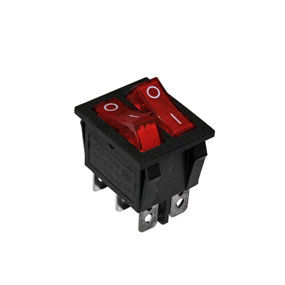 Intrerupător dublu cu LED roșu, model 02-546, pentru controlul circuitelor electrice, cu curent nominal de 16A și durabilitate de 10.000 de cicluri.