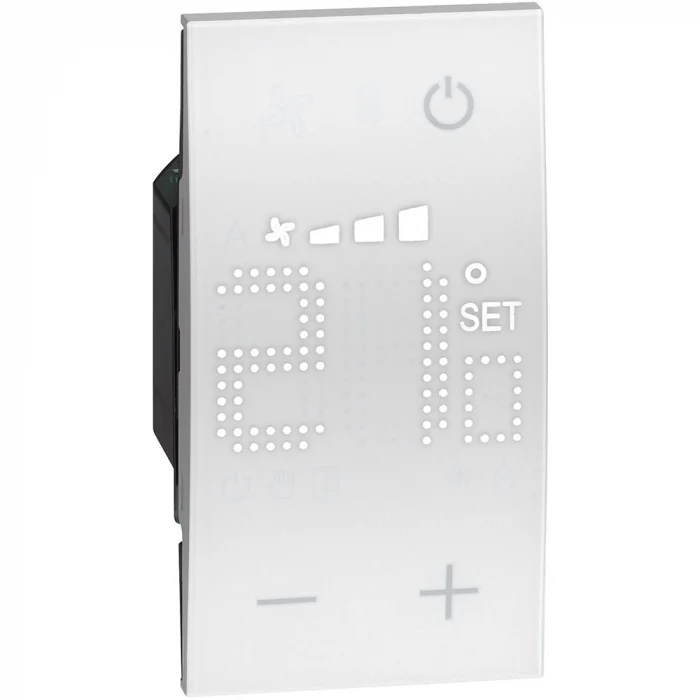 Termostat încastrat cu display retroiluminat pentru controlul temperaturii unei zone individuale. Dispune de un senzor de temperatură și un intrare pentru conectarea unei linii de contact (de exemplu, contact fereastră). Permite gestionarea diferitelor tipuri de sisteme și reglarea vitezei ventilatorului în cazul utilizării ventiloconvectoarelor. Posibilitate de funcționare automată (vară/iarnă) cu sisteme compatibile.