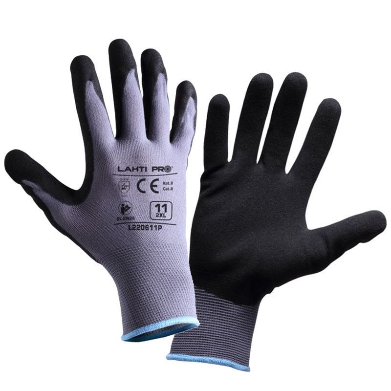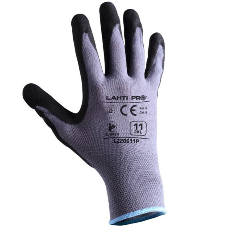 Mănuși de protecție LAHTI PRO L220610K, mărimea 10, negru-gri cu agățătoare, realizate din poliamidă, poliester și nitril, oferind rezistență la abraziune și aderență optimă.