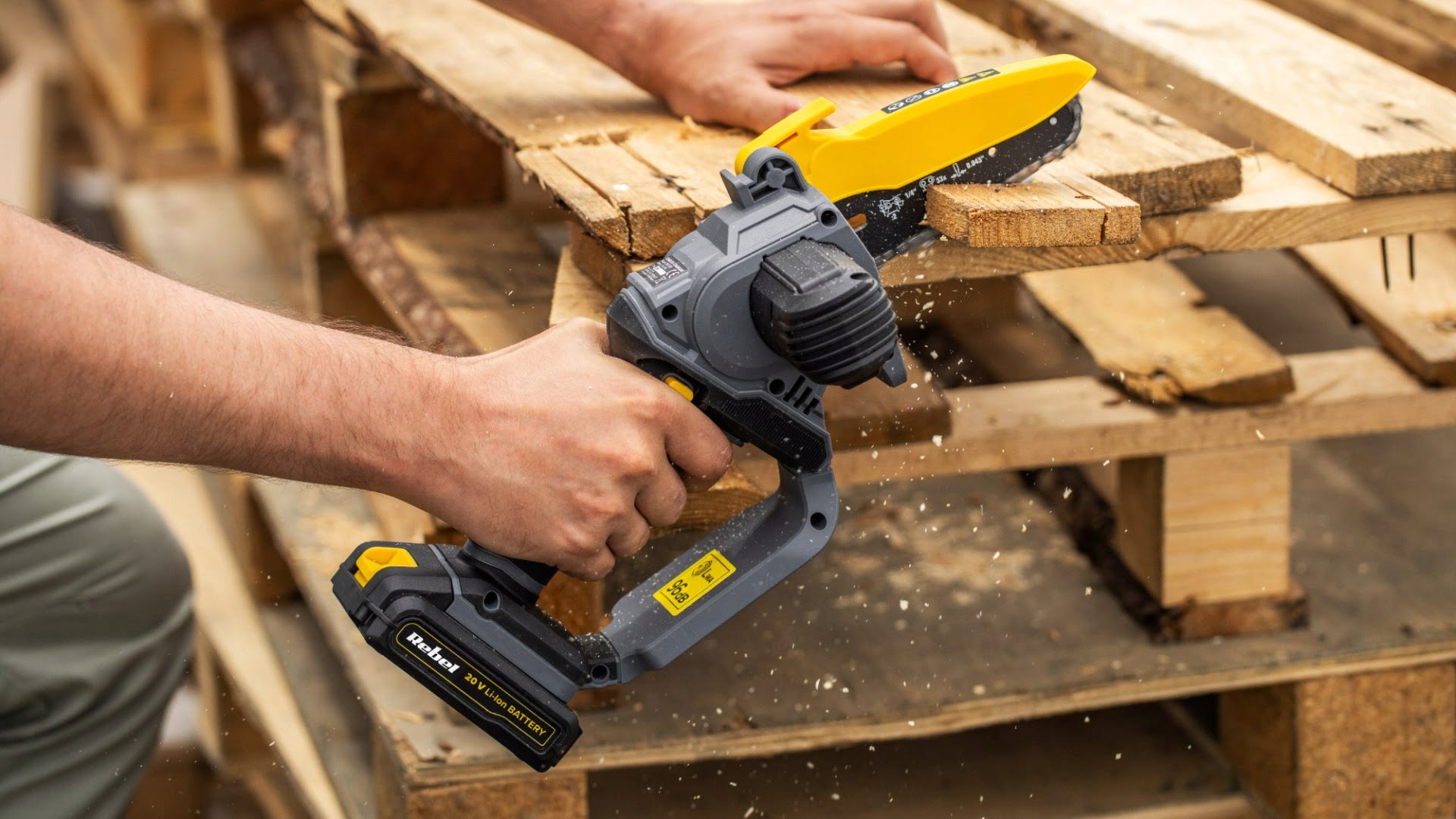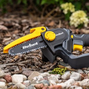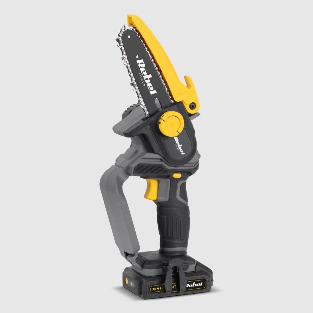 Mini fierăstrău cu lanț Rebel RB-1034, 20V, fără acumulator, ideal pentru tăierea ramurilor, design compact și funcții de siguranță.