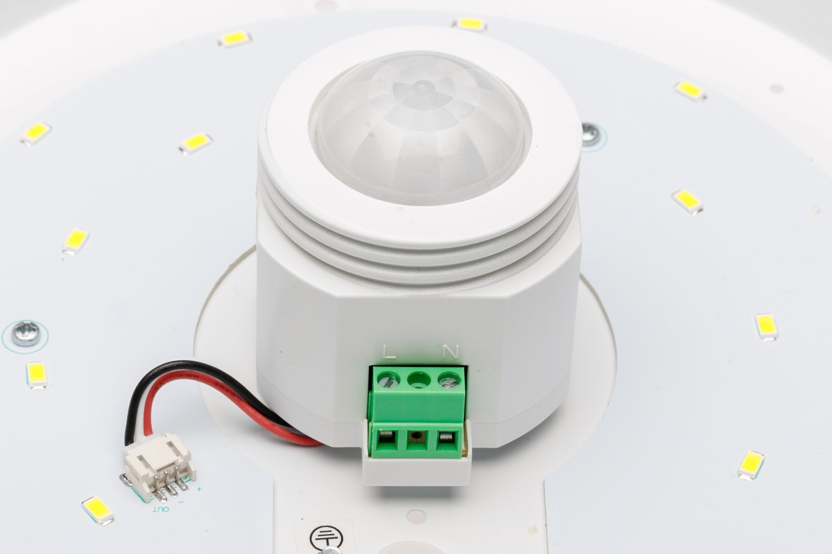 Plafonieră LED de 12W cu senzor de prezență, lumină neutră 4000K, design modern și eficiență energetică.