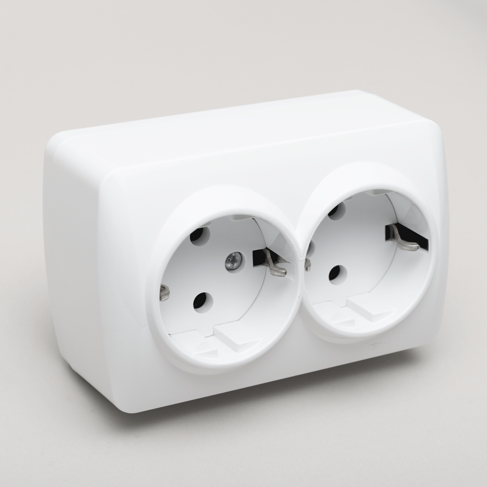 Priză dublă aplicată cu protecție pentru copii, curent nominal 16A, culoare albă, gama Alsu de la EL-BI.