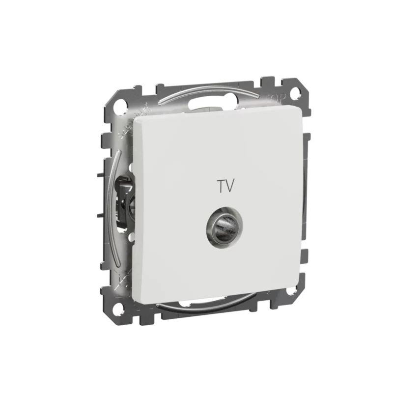Priză TV finală 4dB albă din gama Sedna Design de la Schneider Electric, ideală pentru conexiuni TV de calitate superioară, cu design elegant și montaj încastrat.