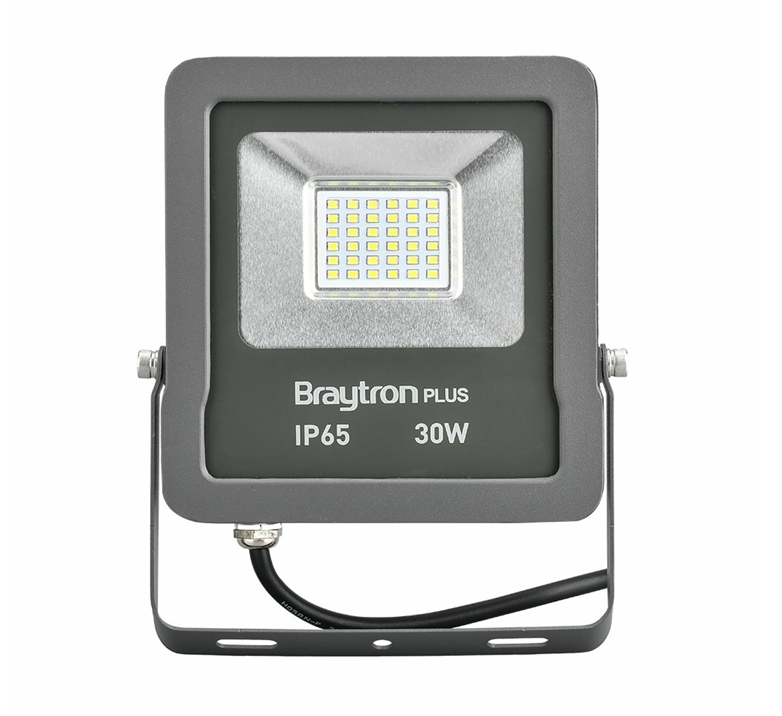 Proiector LED 30W Braytron, 2400lm, 6500K, IP65, gri, ideal pentru iluminat exterior eficient și durabil.