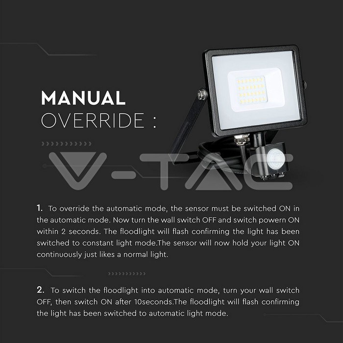 Proiector LED cu senzor de mișcare V-TAC 453, 20W, 1600 lm, lumină rece (6400K), IP65, cablu 1m, Aluminiu, Negru, clasa energetică F.