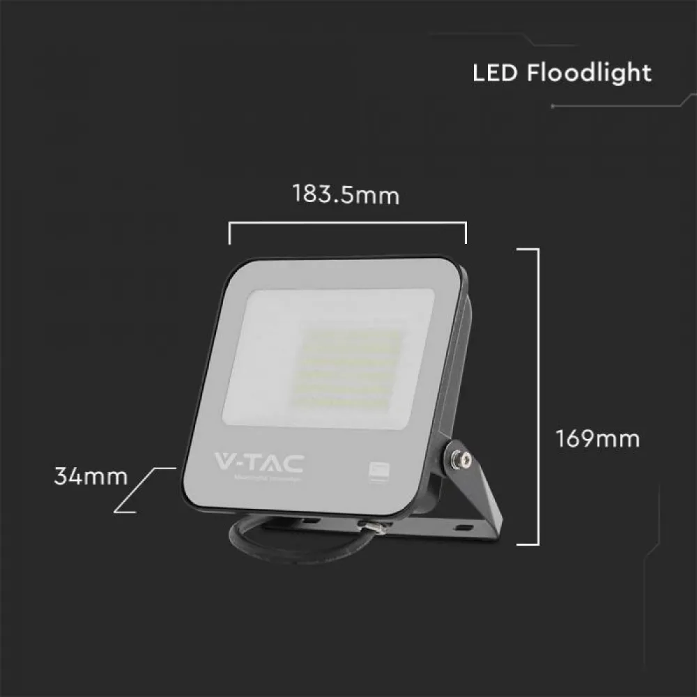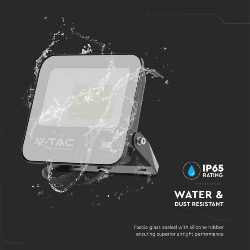 Proiectorul LED V-TAC de 50W este echipat cu cipuri LED SMD de înaltă calitate de la Samsung, oferind o eficiență luminoasă de 115 lm/W și un flux luminos de 5750 lumeni. Cu o temperatură de culoare de 6500K, acest proiector emite o lumină albă rece, ideală pentru iluminarea exterioară.
