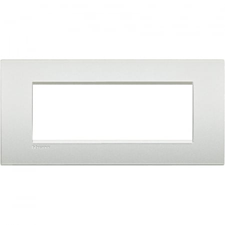Rama ornament de 7 module albă din seria LivingLight de la BTicino, fabricată din termoplastic de înaltă calitate, potrivită pentru montaj încastrat și configurări complexe de prize și întrerupătoare.