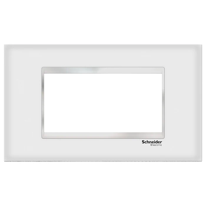 Rama decorativă Easy Styl cu 4 module, fabricată din sticlă albă cu accente cromate, oferă un design modern și elegant. Este compatibilă cu gama Easy Styl și se instalează rapid prin clipsare, fiind ideală pentru diverse aplicații interioare.