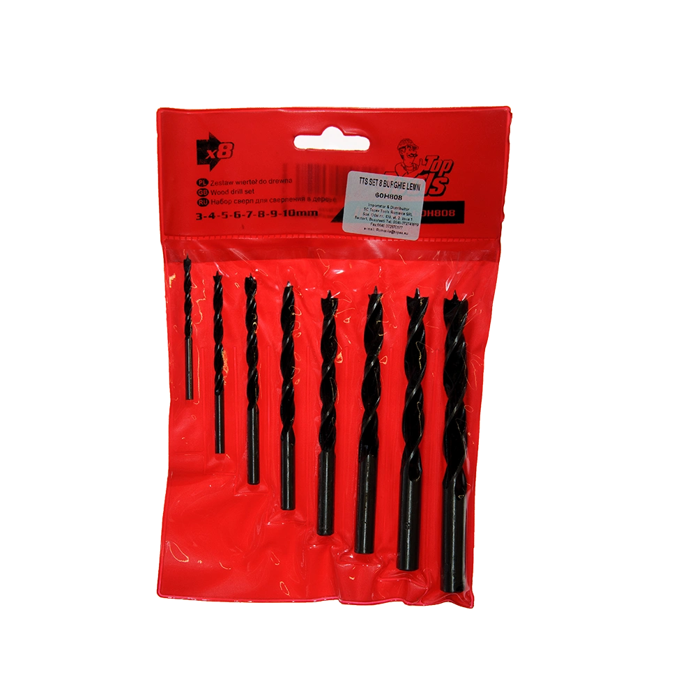 Set de 8 burghie pentru lemn Top Tools 60H808, diametre 3-10 mm, fabricate din oțel de înaltă calitate, ideale pentru găurirea precisă a lemnului.