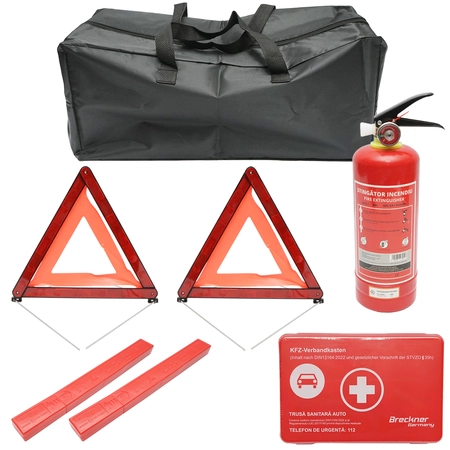 Set complet de siguranță auto, conform legislației rutiere din România, care include trusă medicală omologată, stingător auto cu pulbere ABC de 1 kg, două triunghiuri reflectorizante și husă pentru depozitare. Ideal pentru asigurarea siguranței în trafic și conformitatea cu normele legale.
