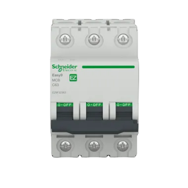 Întreruptor automat tripolar Schneider Easy9 63A, curba C, 4.5kA, pentru protecția eficientă a instalațiilor electrice.