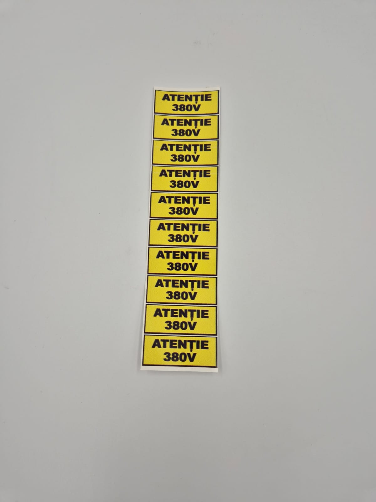 Set de 10 autocolante de avertizare '380V', fiecare având dimensiunile de 25x5 cm. Aceste autocolante sunt esențiale pentru marcarea echipamentelor electrice de înaltă tensiune, asigurând o identificare clară și contribuind la siguranța în mediile industriale și comerciale.