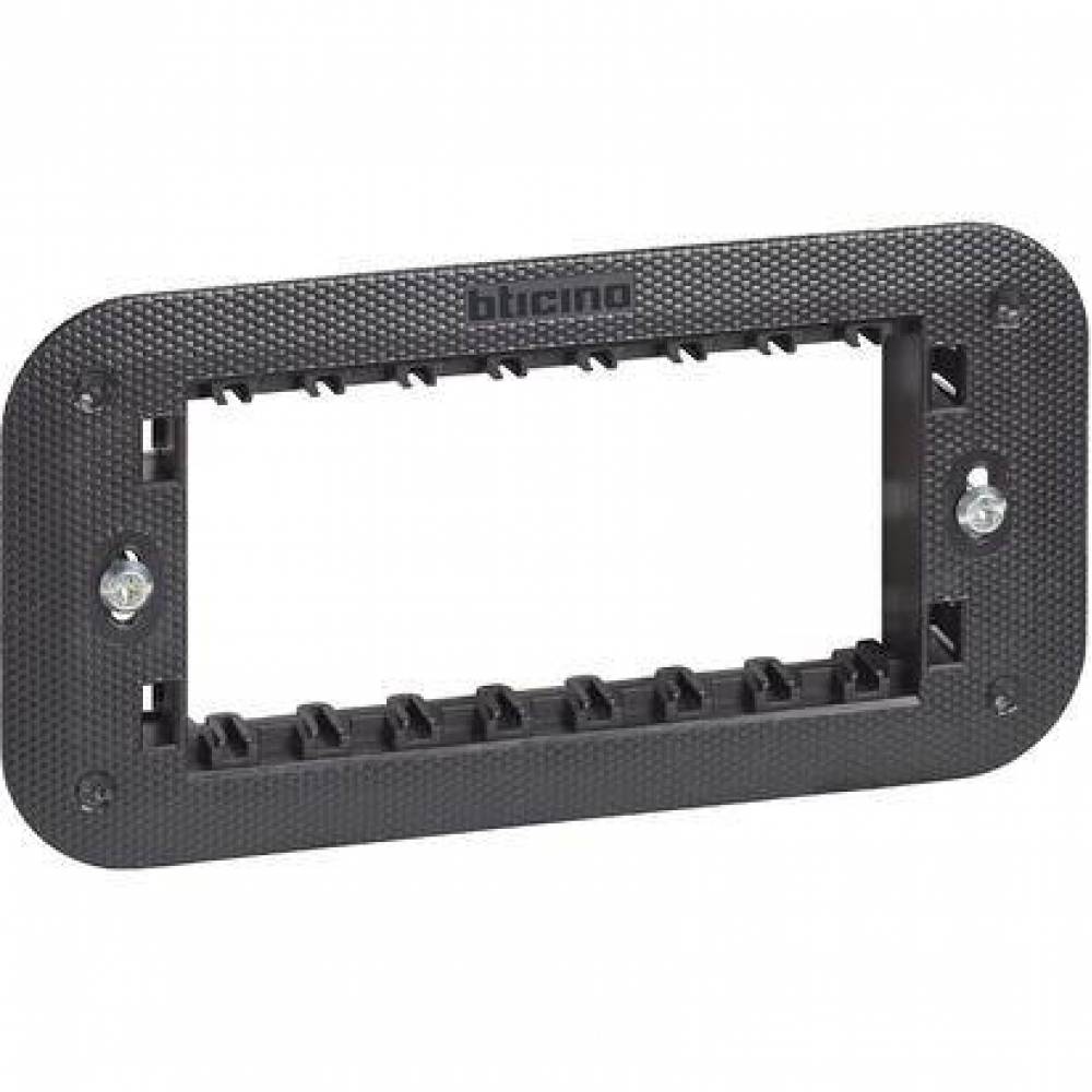 Suport de fixare 4M Bticino Living Now, din plastic negru lucios, pentru montaj sigur și estetic al aparatajului modular.