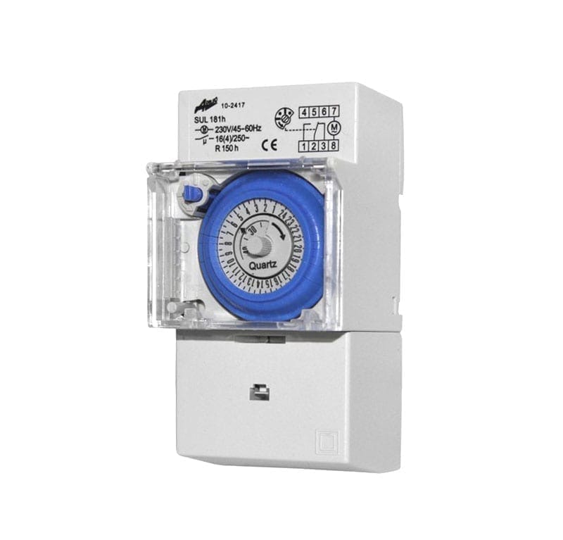 Ceas programator analogic pe șină, 24H, 16A, 150h, 3 module, pentru controlul automat al echipamentelor electrice.