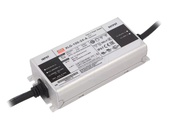 Driver LED MEAN WELL XLG-100-24A, 100W, 24V, IP67, eficiență 92%.
