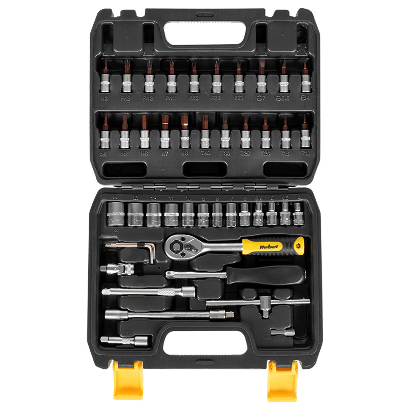 Trusa de scule Rebel conține 46 de piese esențiale pentru diverse lucrări de reparații și întreținere. Fabricate din oțel crom-vanadiu de înaltă calitate, aceste unelte oferă durabilitate și rezistență la coroziune. Mânerul cauciucat asigură o prindere confortabilă și sigură.