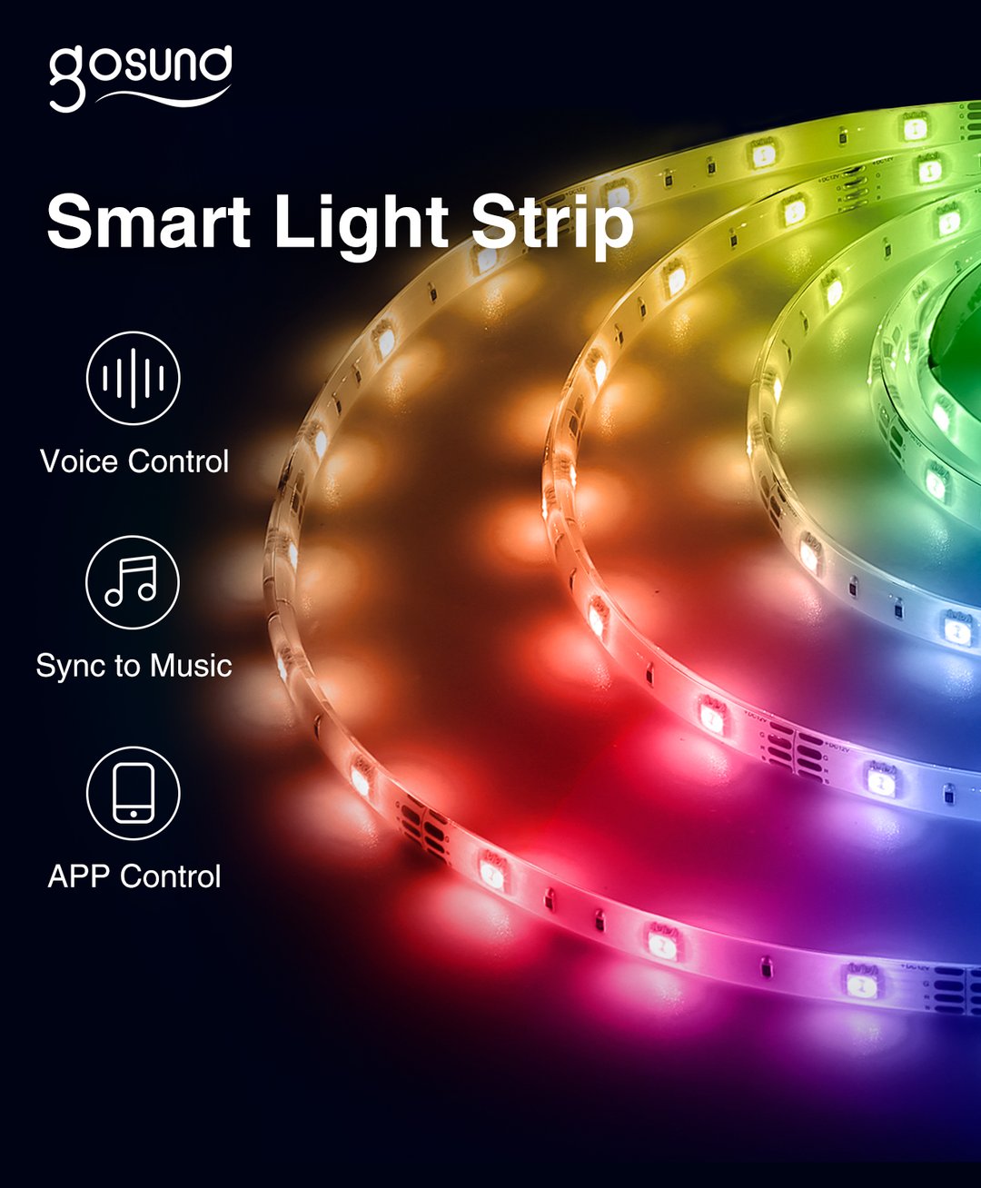 Banda LED inteligentă Gosund SL2 de 5 metri, control WiFi, compatibilă cu Alexa și Google Assistant, iluminare personalizabilă și instalare ușoară.