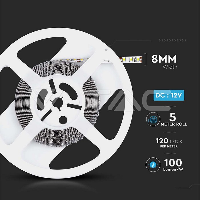 Bandă LED V-TAC 12V 3528 120LED/8W/M IP20 4500K 5M Rola