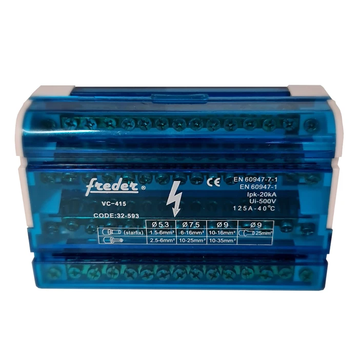 Bara de nul la cutie cu 4 bare a câte 15 poli, destinată montajului aparent în tablourile electrice. Fabricată din plastic și cupru, suportă o tensiune nominală de 500V și un curent nominal de 125A. Dimensiunile sunt 133 mm lungime, 50 mm lățime și 50 mm înălțime, iar culoarea este albastră.