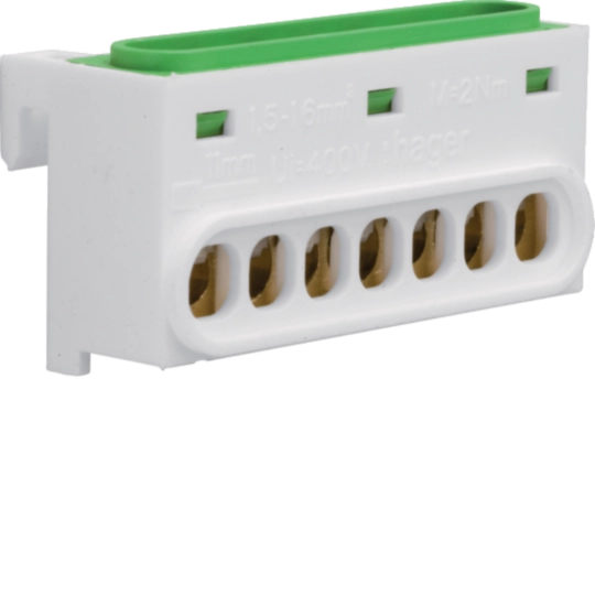 Bornieră de împământare Hager KN22E cu 22 de borne, conexiuni rapide și curent nominal de 63A.