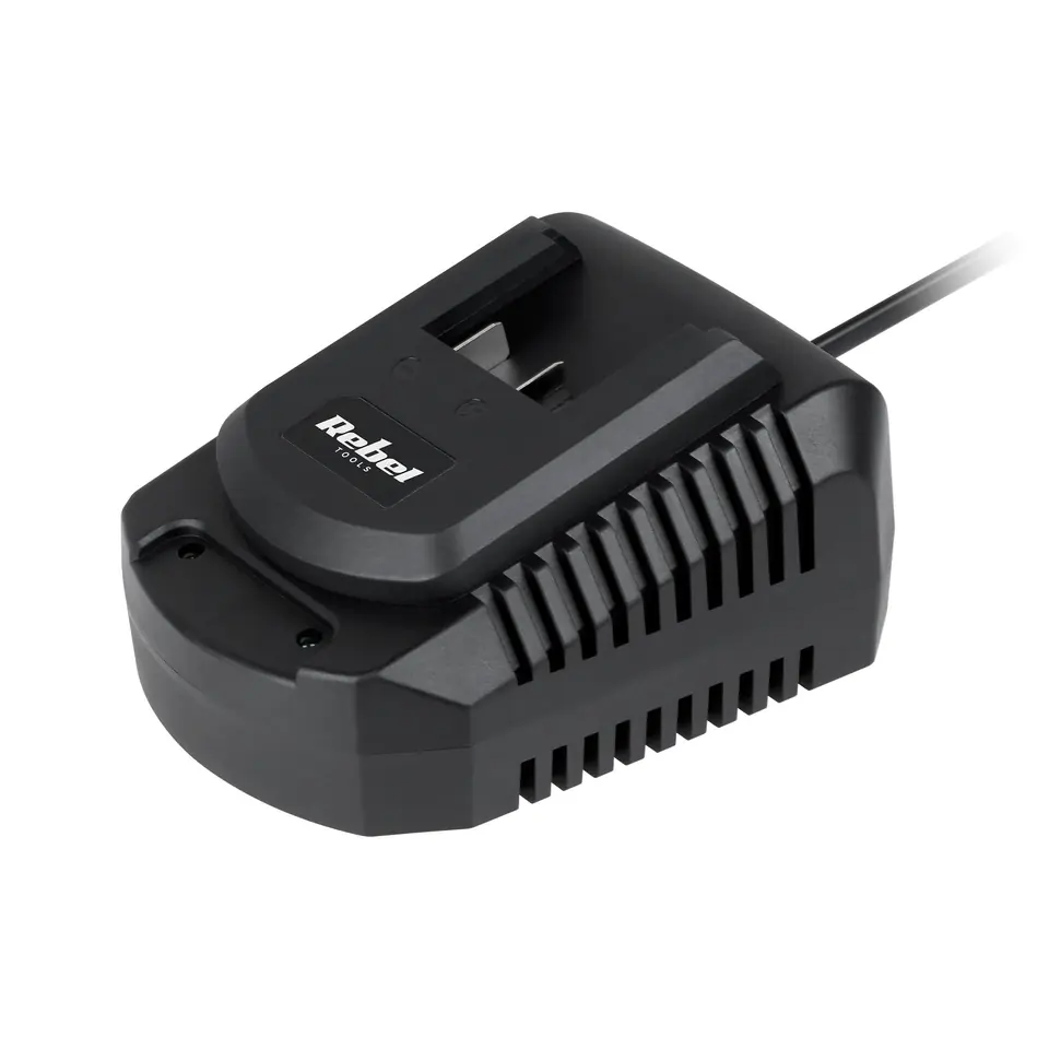 Încărcător rapid și eficient pentru acumulatorii de 20V ai sculelor electrice Rebel Tools, cu indicatori LED și protecții de siguranță.