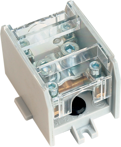 Clema de ramificație cu 1 intrare de 16-95mm² și 4 ieșiri de 6-16mm², fixare pe șină sau suprafețe plane.