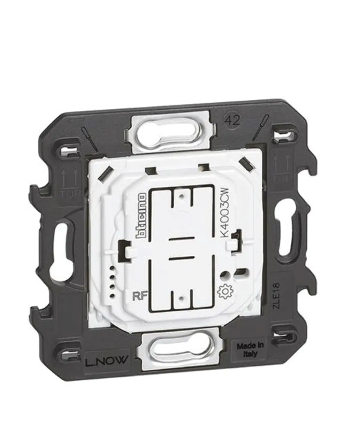 Întrerupător wireless BTicino Living Now K4003CW permite controlul ON/OFF al unuia sau mai multor dispozitive conectate pentru iluminat. Se instalează pe suprafață cu adezivi repoziționabili (furnizați standard) sau în cutii montate încastrat. Include LED pentru indicarea epuizării bateriei. Alimentat de o baterie de tip CR2032, de 3 V, cu o durată de viață estimată la 8 ani. Ocupă 2 module.
