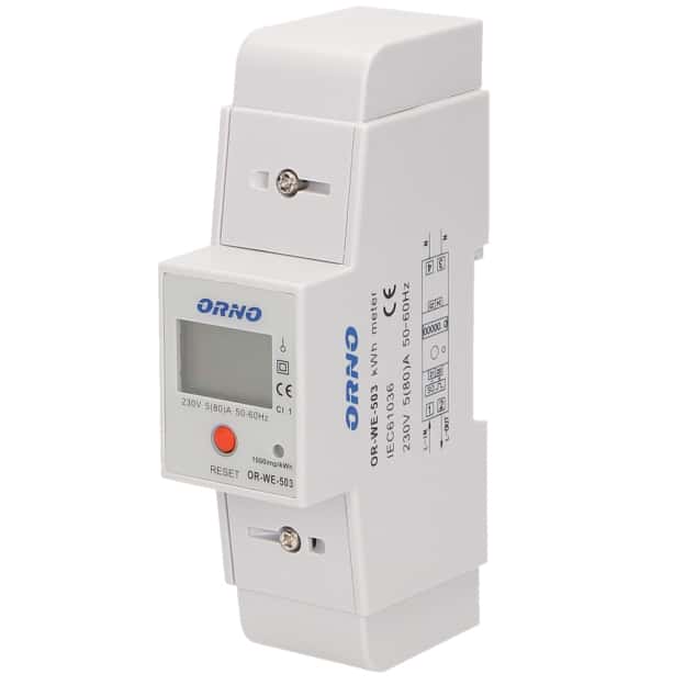 Contor monofazic digital OR-WE-503 de la Orno, destinat măsurării directe a consumului de energie electrică în sisteme monofazate. Echipat cu un circuit electronic special care generează impulsuri proporționale cu energia consumată, semnalizate printr-un LED intermitent. Numărul de impulsuri este convertit și afișat pe un ecran LCD (5+1). Dispune de un indicator suplimentar cu posibilitate de resetare și ieșire de impulsuri pentru integrare în sisteme de monitorizare.