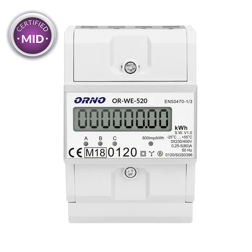Contor trifazic 4 module, 3 x 80A, 3x230V/400V AC, 50/60Hz, certificare MID OR-WE-520