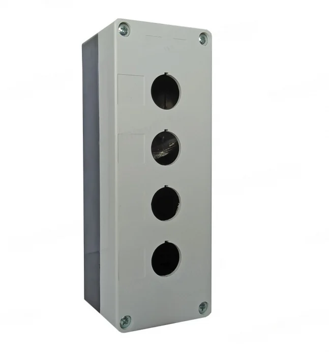 Cutie de comandă neechipată pentru 4 butoane, cu grad de protecție IP54, potrivită pentru diverse aplicații industriale.