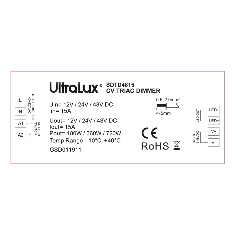 Dimmer TRIAC SDTD4815 Ultralux pentru controlul intensității luminii benzilor LED monocolore, compatibil cu tensiuni de 12-48V DC și sisteme de control SDTD și SDWTD.